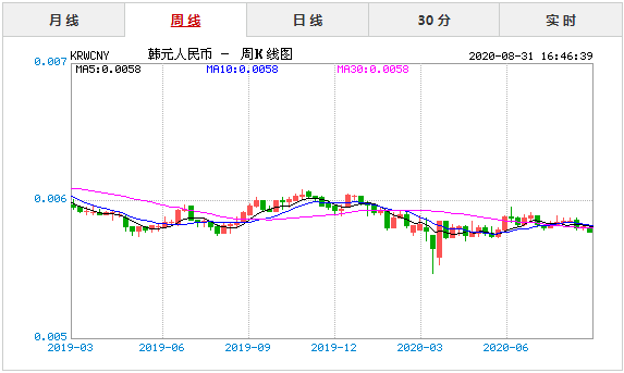 货币兑换 1韩元=0.005776人民币 1人民币≈173.118韩元 2020年8月31日银行间外汇市场人民币汇率中间价为:1韩元=0.005776人民币,1人民币≈173.118韩元。