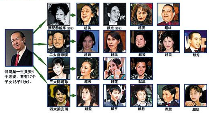 据香港媒体报道,当地时间5月26日,港澳知名爱国企业家、第9届至第11届全国政协常委何鸿燊逝世,享年98岁。“赌王”何鸿燊有一妻一妾,以及两位公开承认的伴侣(俗称姨太太)。四人共为何鸿燊生育了16名子女,其中5名儿子和11名女儿。(有一说法是17名子女,四太梁安琪所生儿子何猷佳夭折) 赌王何鸿燊逝世家族