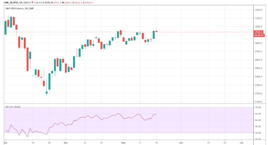 隔夜消息,据美国C报道,生物技术公司odra称,COVID-19疫苗的早期临床试验取得初期成果。在这一消息刺激下,周一(5月18日)三大美股收涨,其中道指涨幅为3.85%。不过,周二(5月19日)标普500指数期货录得一根较小的倒锤线(阴线),暗示标普500指数周二开盘可能下跌。 标普500指数期货日线图