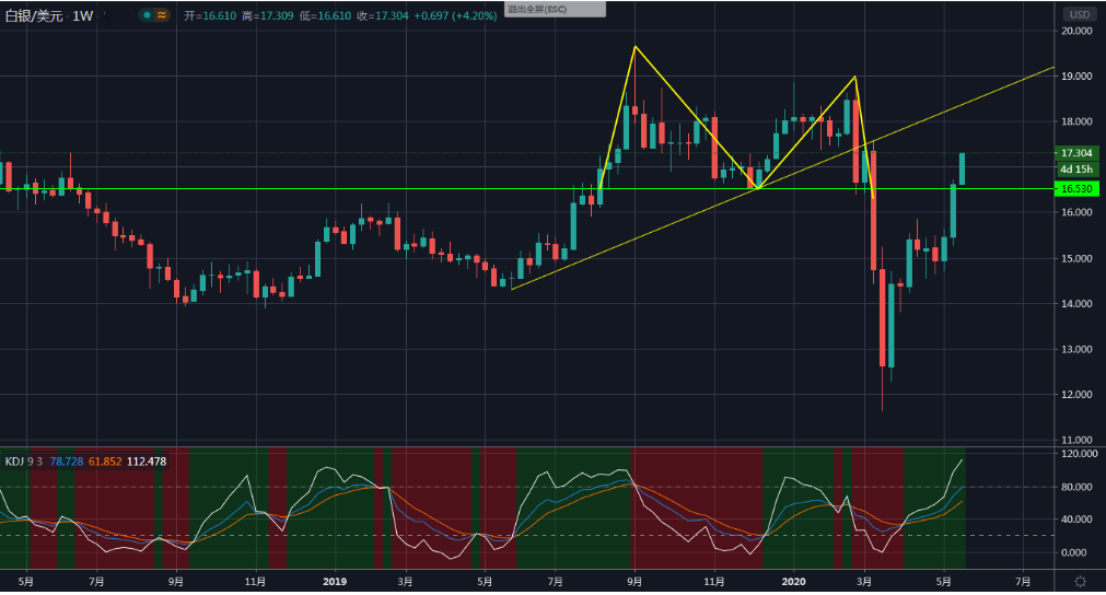 本月初银价下探14.70水平后持续走强,至周一(5月18日)欧市早盘最高触及17.31,涨幅超过15%。然而,日线ACD及KDJ指标却有强烈的回落修正需求,后市宜逢低企稳后买入。 周线:V反并涨破强阻 白银的周线图表形态显示,价格于3月16日当周下探11.60附近,创逾11年新低。随后行情企稳反弹,5月11日当周大幅收涨并企上此前