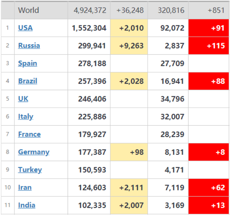 新冠肺炎疫情继续在全球蔓延。截至北京时间5月20日10时21分,全球新冠肺炎累计确诊病例突破498万例,达到4986332例,累计死亡病例超过32.4万例,达到324910例。美国新冠肺炎累计确诊病例全球最多,超过157万例,达到1570583例,累计死亡病例超过9.3万例,达到93533例。 全球确诊病例超过10万例的国家增至11个,分