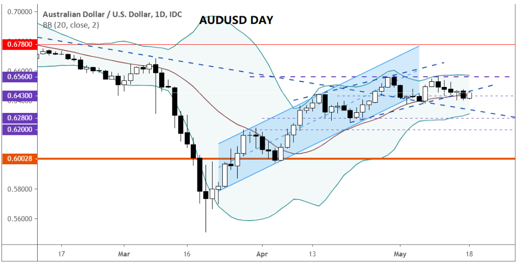 日图显示,布林带趋于走平,澳元/美元在布林带中轨0.6430附近整理,短线缺乏方向。若上行初步阻力在0.6480,上破可能进一步反弹指向关键阻力0.6560。而若下行,下方支持关注0.6400,跌破可能进一步走弱指向布林带下轨0.6310至0.6330支持区域。