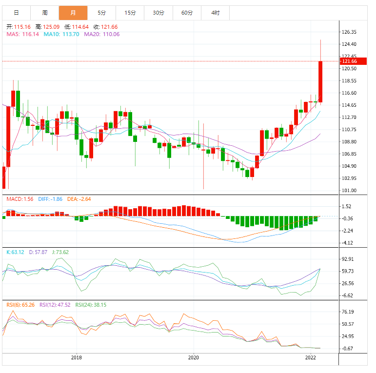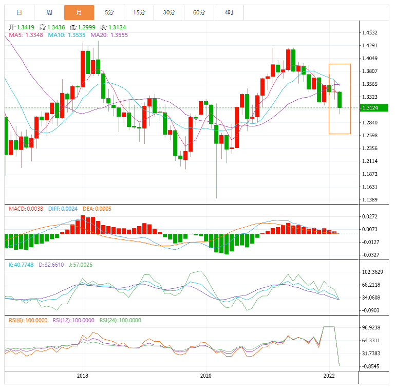 4月英镑兑美元行情,英镑兑美元从4月初的开盘价121.69,截至收盘价129.86。日元4月整体上涨817点,日元在4月28日上涨至月内高点131,25。 4月美元兑日元汇率走势分析 第一周美元/日元行情 第一周,日元大跌逾1%。除了美元走强带来的利空,日本央行似乎乐意看到弱势日元,对日元近期下跌会推高进口成本,进