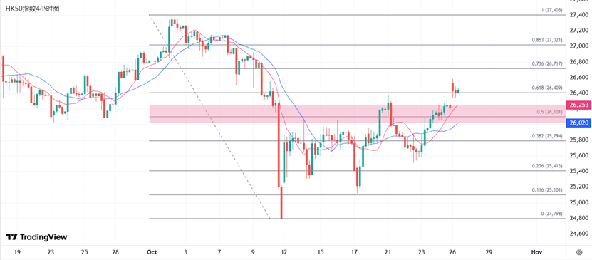 ATFX港股:贸易利好传来,港股续弹27000关口有待突破 ATFX港股:中美就贸易等议题形成初步共识,市场气氛造好,恒指继上周重越两万六关后延续上行,今早高开335点或1.28%,半日升267点,收报26427,午后维持逾200点升幅。国企指数半日涨0.95%报9452点,恒生科技指数涨1.48%至6149点。 科技股支撑大市向好,小米逆市
