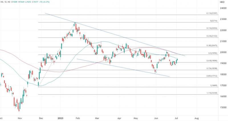 ATFX港股:强势开局后升势放缓,恒指或在关键均线遇阻 ATFX港股:港股下半年开局首日升逾300点后,今早低开高走,半日升逾百点,恒指半日收报19412,升106点或0.55%;国指收报6624,升34点或0.5%;科指半日升0.9%,收4091。南下资金半日净流入22.49亿港元,大市成交额为390亿港元。 科技指数午后短线跳水,转为轻