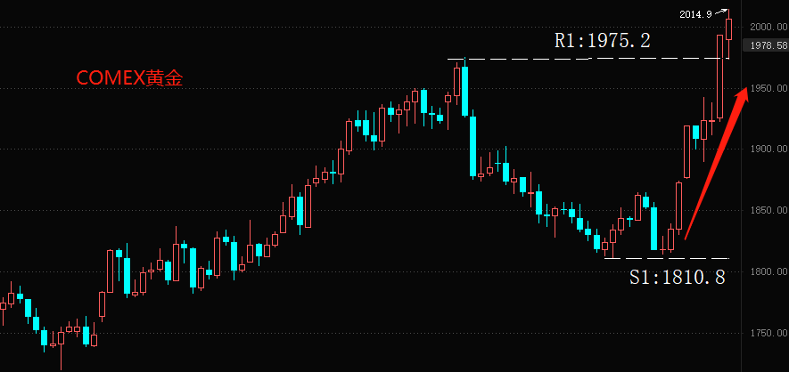 ATFX国际:黄金击穿2000美元关口,距离历史最高点又近一步 ATFX国际:今日15:07,国际金价突破2000美元/盎司,15:32分,冲高至2014.7美元/盎司,之后出现小幅回,但市场价格依旧处于2000美元之上。2000美元是一个关键的价位,可以把它看做黄金的强弱分水岭。两千美元以下,市场的避险情绪较为冷淡,黄金处于弱势格局状
