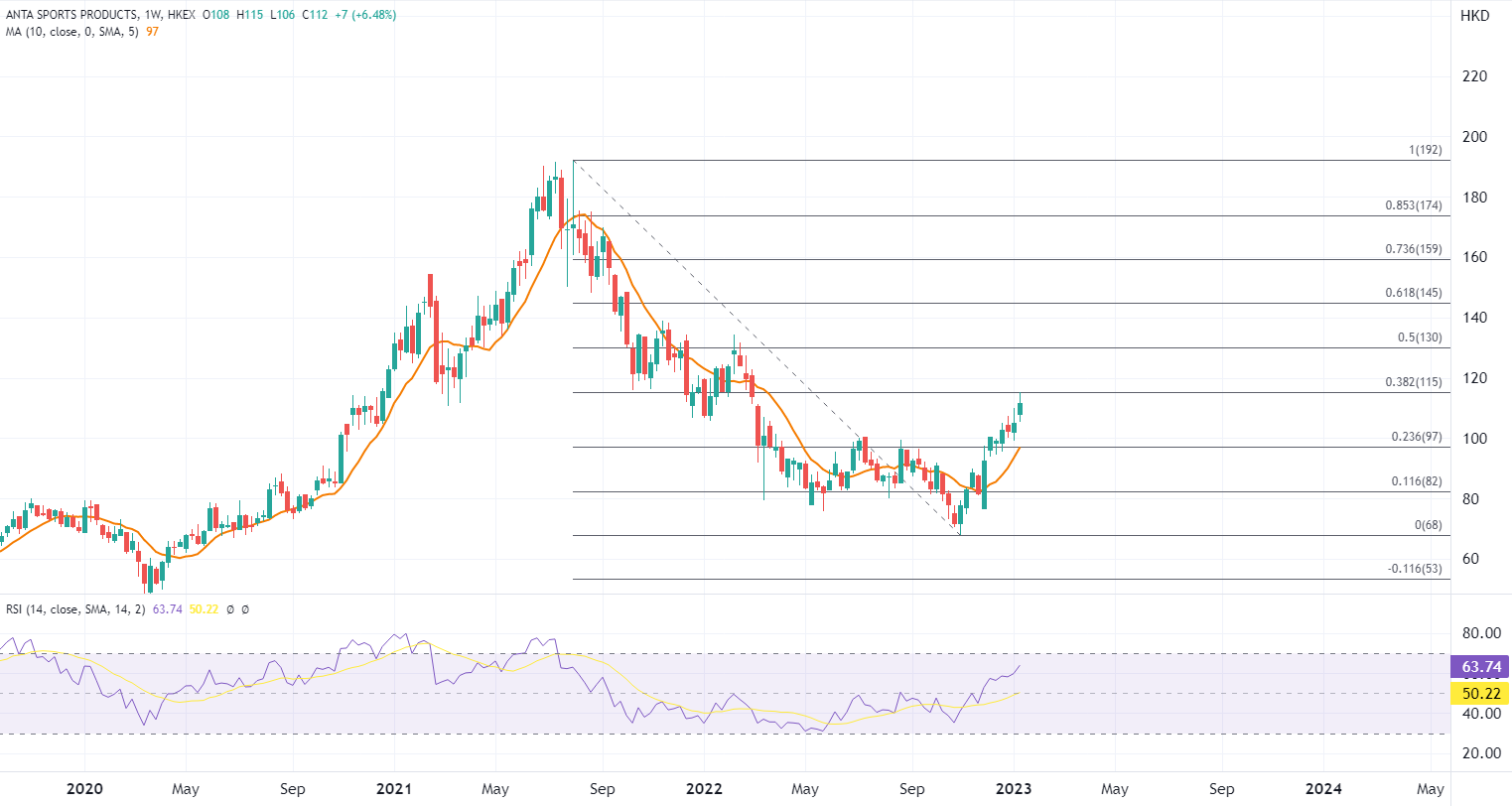 ATFX港股:随「扩内需」大方向,安踏股价开始发力 ATFX港股:今日港股高位倒跌,不过体育用品股中安踏(2020.HK)高开4.8%,创近11个月高,不过午后升幅收窄至不到2%。 据安踏昨晚公布,按零售价值计算,去年第四季度「安踏」品牌产品的零售金额录得按年高单位数的负增长,FILA品牌产品录得10%至20%低段的负增长,相