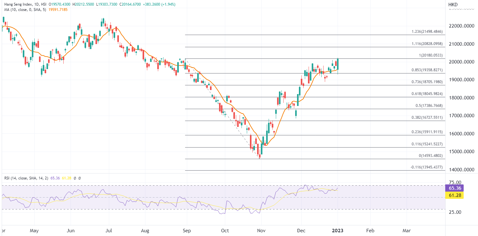 ATFX港股:2023首个交易日,恒指突破两万点大关 ATFX港股:今日港股踏入2023年首个交易日,港股半日波动加大,美股指数期货今早向下以及内地日前公布的上月制造业采购经理指数逊于预期,恒指低开逾两百点,不过随着人民币离岸价今早创逾4个月高位而回升。 港股早段盘中跌近500点后倒升逾两百点,半日重上两万点大关