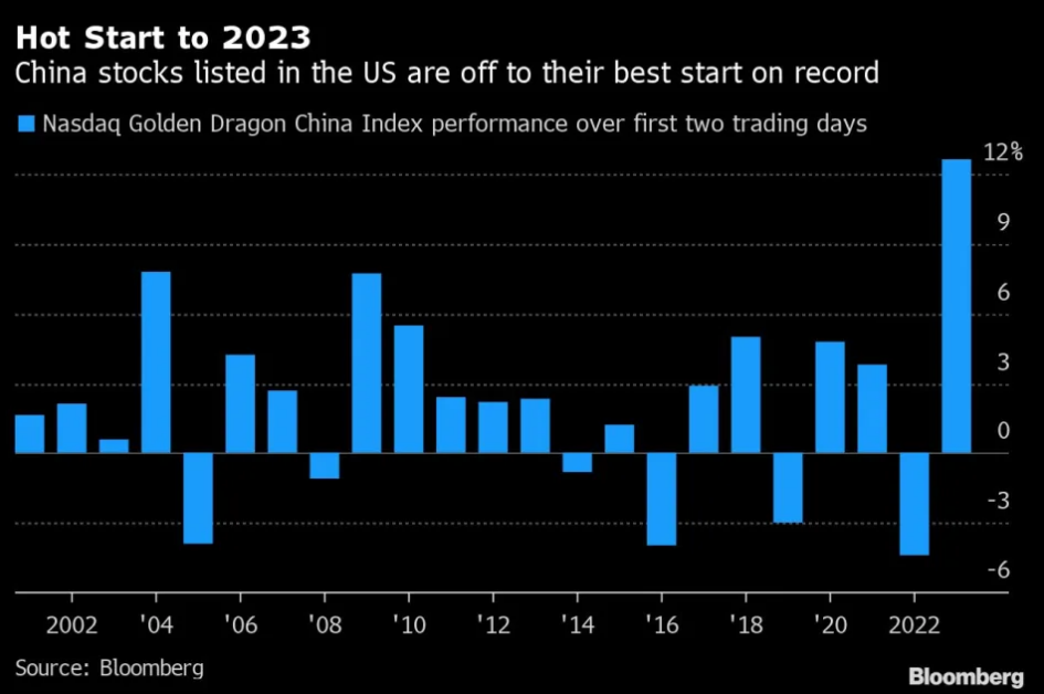 ATFX港股:中概股创有史最佳开门红,科技股再成热门配置! ATFX港股:继今年首个交易日创下开门红后,隔夜中概股保持强劲表现,纳斯达克金龙中国指数涨超8%,迎来史上最佳开年,连续两日累计涨幅达到13%,为2001年有数据以来最高水平。 ▲ATFX图 隔夜阿里巴巴美股上涨13%,创下去年6月以来最大单日涨幅,市值