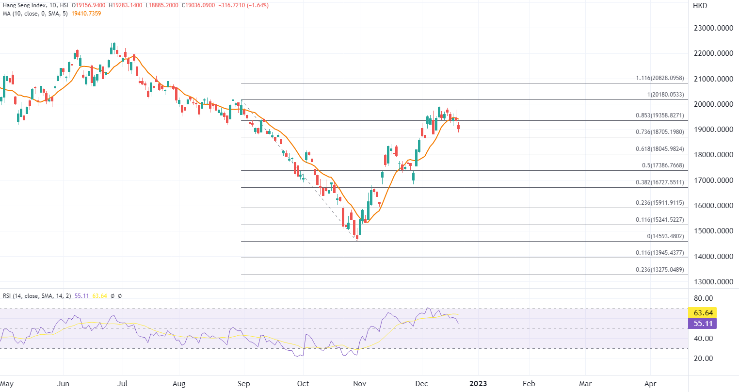 周一香港股市开盘高走,随后走势转跌,收盘在19316点下跌幅度0.69%,全日低位附近。市场看来正观望明日早上中国央行公布12月中国贷款市场报价,截至周一路透调查显示,周二中国可能连续第四个月维持基准贷款利率不变,但考虑近期中央委员会的报告提及内容对货币宽松政策的预期正在上升。但目前对于股市来说没有太明显提