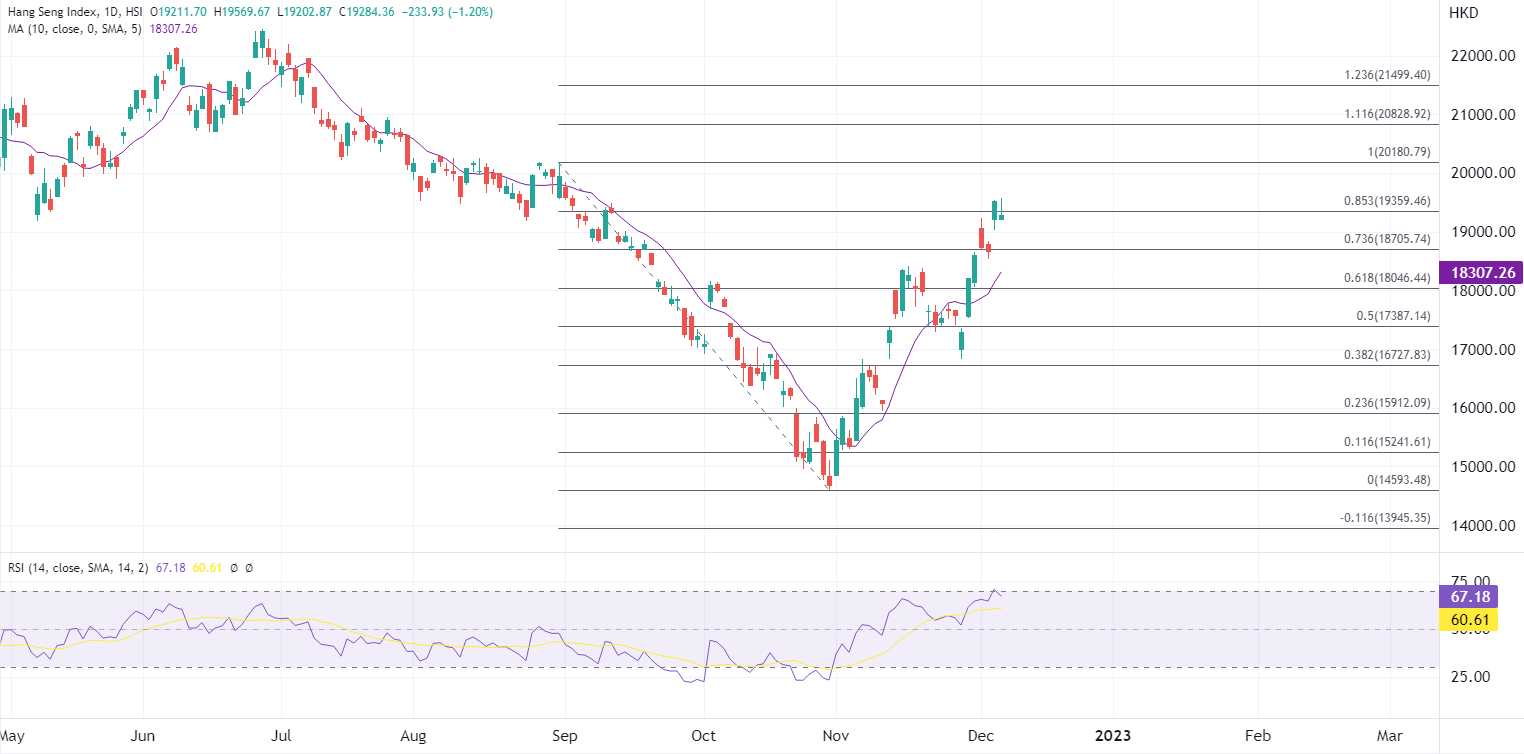 ATFX恒指追踪市场聚焦美国通胀数据及下周美联储议息 ATFX恒指:美国经济衰退忧虑升温和美联储12月加息幅度不明朗使投资者担忧加剧,大多数亚洲股市周三回落。现在的焦点是本周晚些时候公布的美国生产者通胀数据,以及定于下周举行的美联储今年最后一次会议。 另外,中国缩减防疫限制措施的利好消息已在近日开始消化,