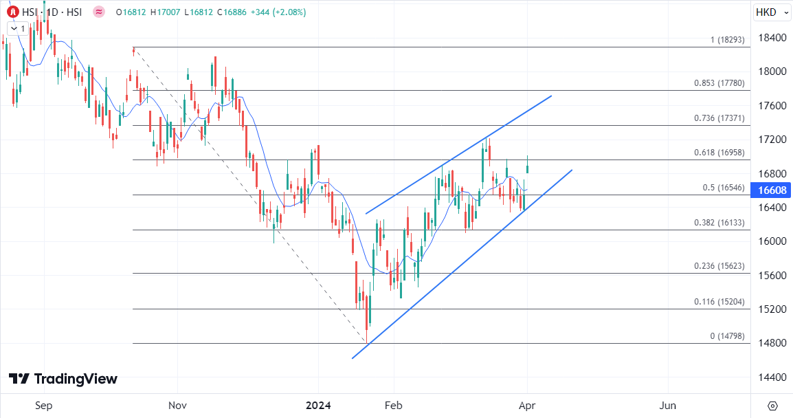 ATFX港股:长假后港股开局强劲,恒指半日大涨近400点 ATFX港股:港股复活节长假期后4月首个交易日造好,恒指高开270点后升幅扩大至逾400点一度冲上万七点关口。恒指半日升390点或2.4%,报16931。国指升152点或2.6%,报5962。科指升82点或2.4%,报3559。 科技股方面,科技指数午后最新涨近1.8%,小米集团(01810)首款