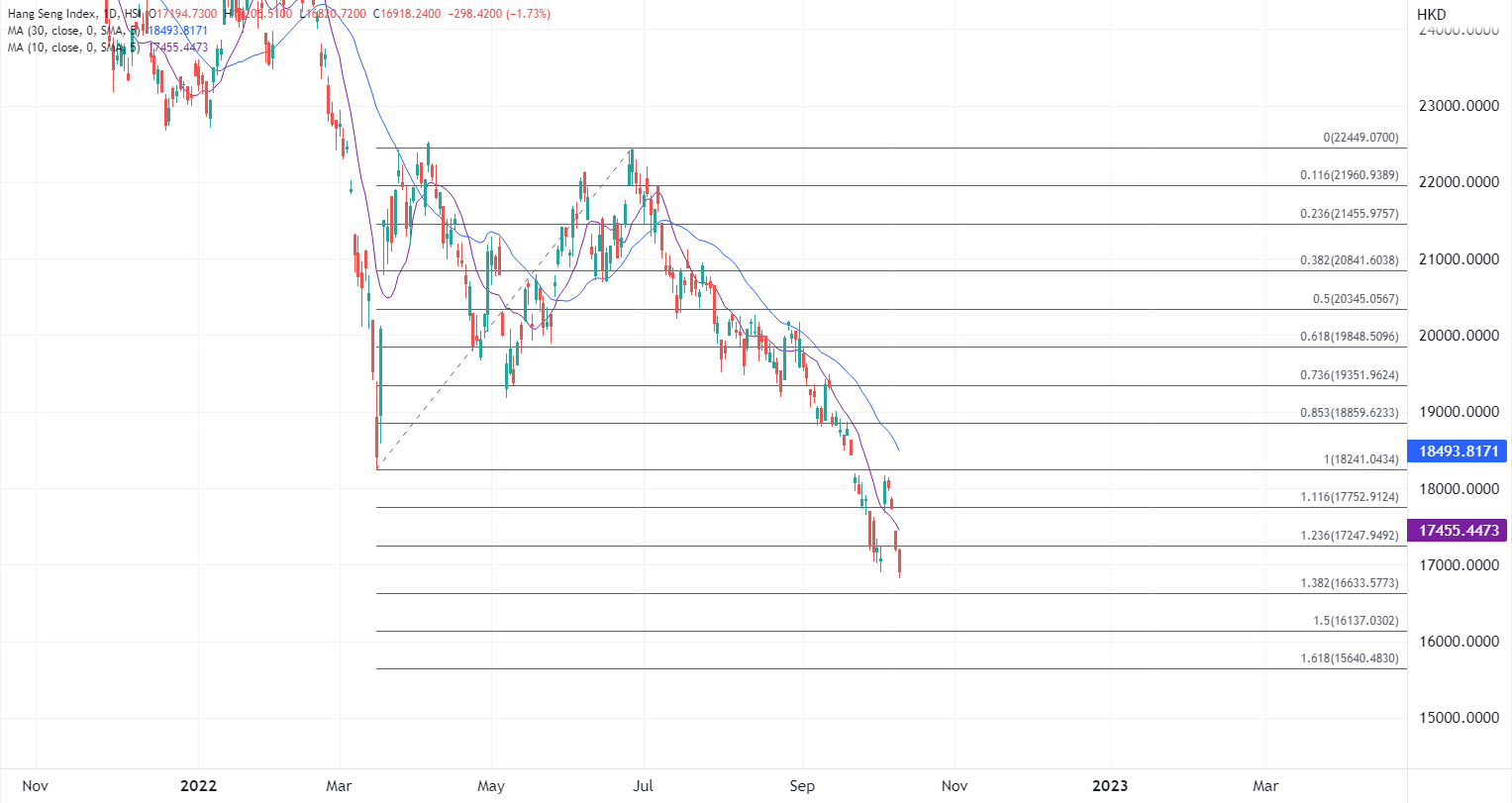 ATFX港股:大型科技股探底,恒指再试一万七关口下方 ATFX港股:隔夜美股向下中概股表现欠佳,港股上日插523点后,今早跌势未止,中午失守万七点大关,午后跌近400点,科技指数再创历史新低,午后保持逾2.6%的跌幅。 大型科技股继续探底,由美团(3690.HK)领跌,盘中一度跌逾9%,创今年5月份以来新低,随后跌幅收窄