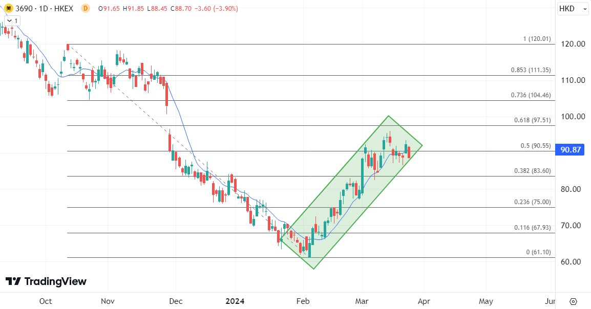 ATFX港股:美团股价绩前回落,待业绩冲击100港元关口 ATFX港股:美团(03690.HK)将于今日公布业绩,昨日股价盘中最高涨逾5%,市场预计上一季度其收入可能维持稳健的增长。 投资者将关注美团管理层提供最新管理层指引,包括外卖业务利润率(透过“拼好饭”等业务拓展低客单价用户)、对骑手补贴成本、到店业务的竞争、