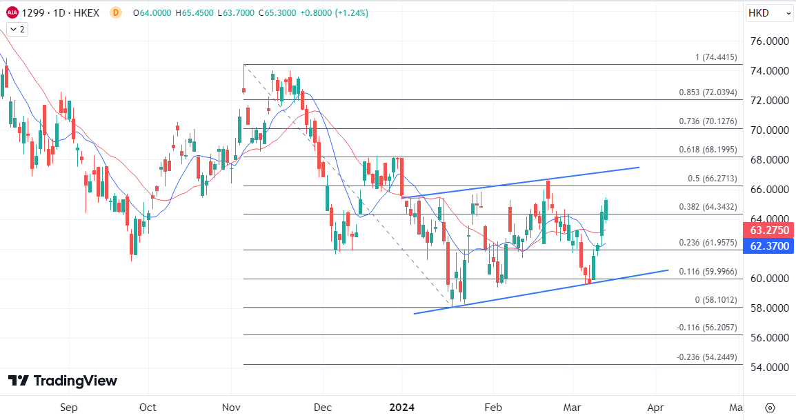ATFX港股:友邦绩前股价四连涨,紧盯区间顶部阻力位 ATFX港股:友邦(01299)将于周四(14日)公布2023全年业绩,市场聚焦在友邦内地的产品组合销售和利润率前景、访港内地客业务可持续性。综合预估友邦2023年纯利介乎52.58亿美元至72.88亿元,较2022年同期的2.82亿元,按年升17.6倍至24.8倍,中位数59.24亿元按年升20