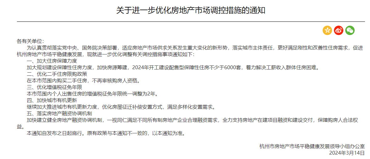 ATFX:杭州全面解除限购,内房股指数受益,但长期趋势仍疲弱 ATFX港股:今晨,杭州市住房保障和房产管理局发布《关于进一步优化房地产市场调控措施的通知》(下称通知),其中提到五点优化调整措施,房地产市场参与者较为关注第二条和第三条。第二条提到:在本市范围内购买二手住房,不再审核购房人资格。意味着杭州全