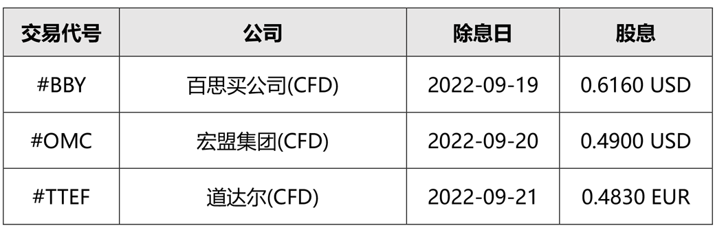尊敬的客户: 您好! 下表提供的资料,是本公司提供的股票及TF差价合约相关股票的除息日,或其他公司行动即将发生的日期。 请注意,所公布的股息或价格调整金额,仅供我们的流动资产提供者参考。这些数字可能会有所变化。 客户持有该股票或TF差价合约至除息日,将会获得或需支付股息;在除