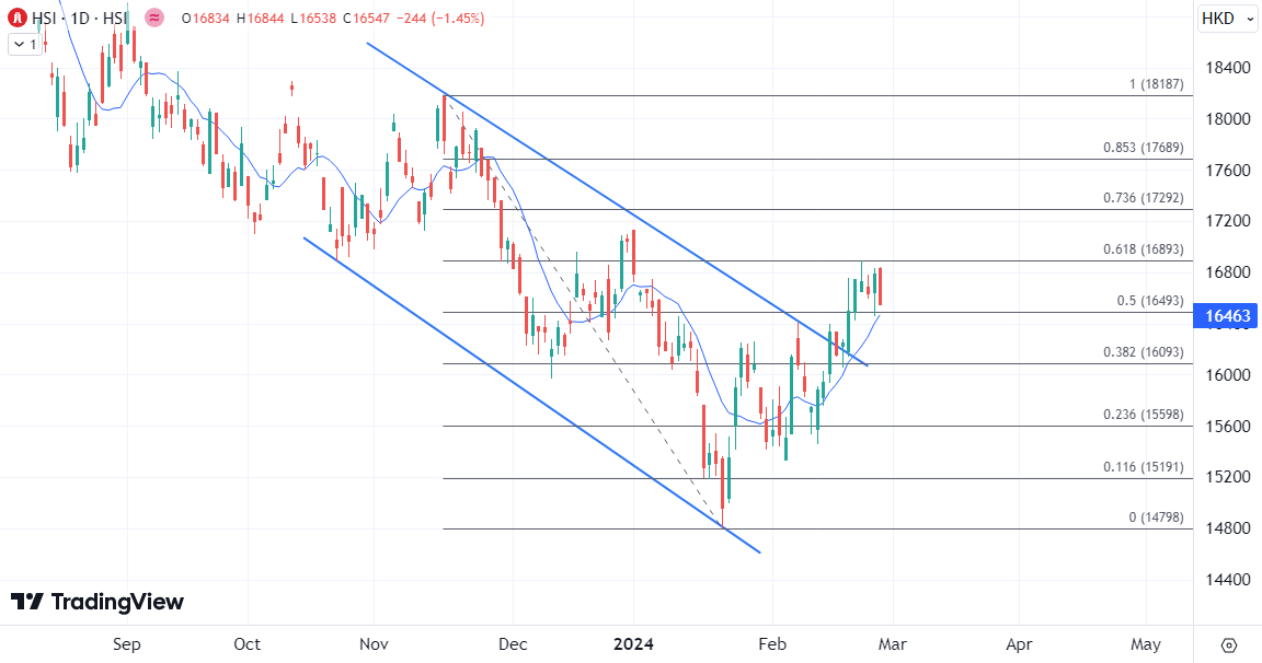 ATFX港股:财政预算公布后动力不足,恒指或向16000关口调整 ATFX港股:港股今日期指结算,恒指昨日收弹156点返百天线后,今早小幅高开。《財政預算案》公布后,恒指午后一度止跌回升但很快回吐,当前走势较为反复。恒生指数半日跌44点,报16745点,成交570.6亿元。科指跌不足0.1%,报3501点。 科技股方面,网易(0