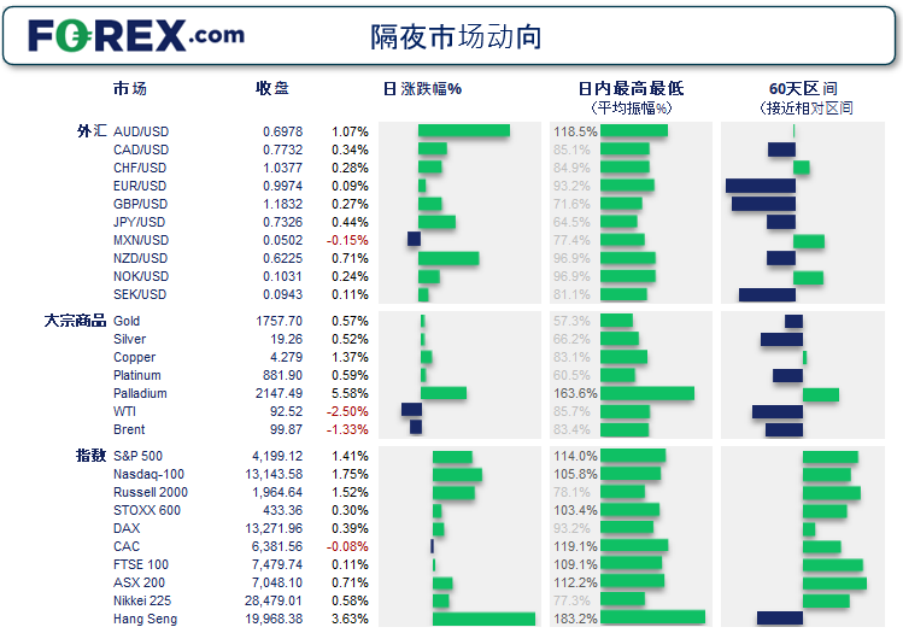 隔夜市场波动 中国政府宣布了新的经济刺激政策,昨天提振了中国股市与澳元,使得后者成为最强主要货币,也是本周目前为止的最强货币。 美国二季度GD季率被从-0.9%上修为-0.6%,但没有改变由连续两个季度负增长所定义的“技术性衰退”的结论。 美股普遍收高,领涨的是科技股。纳斯达克100指数上涨1.75%。 美