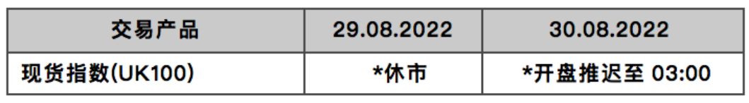 受即将到来的英国夏季银行假日(2022年8月29日-2022年8月30日)影响,FXT富拓的交易安排将有所调整。 请参考下表了解受到影响的金融品种。如果下表中未提到您交易的品种,即表示该品种继续正常交易。 *所有时间均为欧洲东部时间(T)-T4服务器时间。 请知悉,在市场流动性下降情况下,我们可将低流动性金