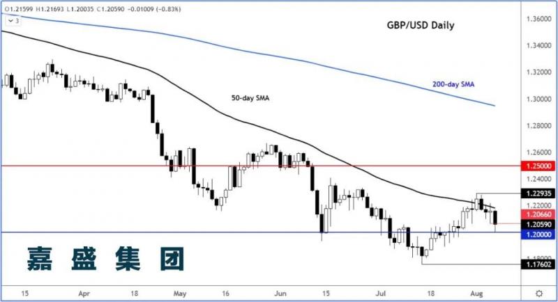 英镑/美元上周接连遭到负面消息的轰炸,先是英国央行预测经济未来5个季度负增长,而且通胀读数达到两位数,后有异常强劲的美国就业报告,再度引发美联储进一步大幅加息的担忧。但在这样的高压环境下,英镑/美元从其1.23附近的顶峰到上周五低点1.20,也才下跌了290点子左右,并不是很多。而按周图计算,英镑/美元环比