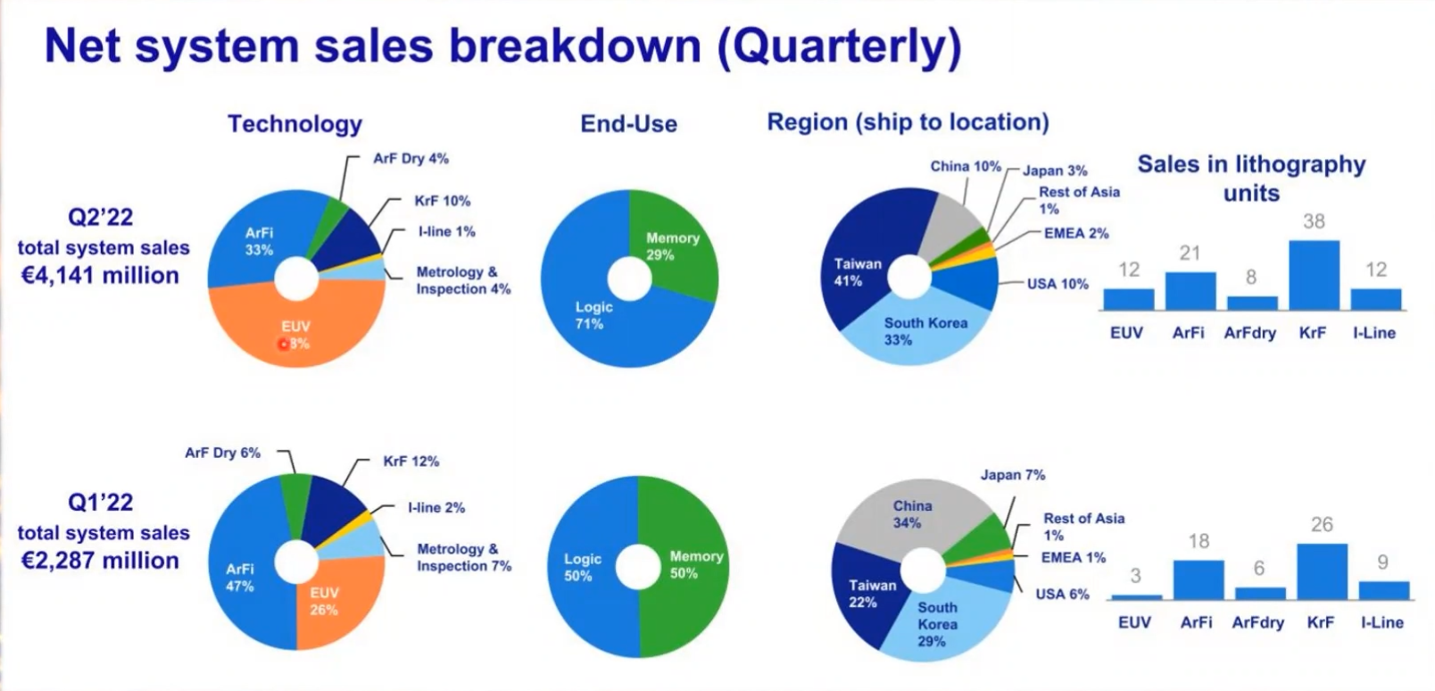 ATFX:“科技霸权”下的阿斯麦,二季度营收与净利双双大增 AL主打产品有两款,分别为极紫外光刻机UV、深紫外浸润式光刻机DUV,后者在财报中以ArFi名称代替。两款产品在二季度的销售收入占比分别为48%、33%,合计81%,处于绝对主导地位。世界范围内,只有AL一家企业可以生产UV光刻机,议价能力强,毛利率高达49.1%