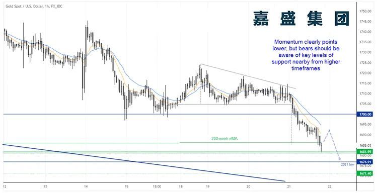 周五(7月22日)亚欧时段,现货黄金震荡微跌,目前交投于1715美元附近,美元的反弹令金价小幅承压,但目前仍守住了隔夜大部分涨幅,因为市场对全球经济衰退和地缘局势的担忧情绪升温,黄金的避险买需在近期美元回调之际有所回升,而且金价周四探底回升,守住了1677附近关键支撑,技术面出现了一些底部信号,前期大跌之后