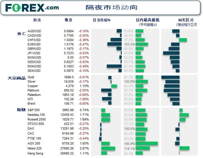 黄金21日亚市早盘跌破1700美元,因投资者在下周主要央行会议前继续减持黄金上市交易基金,这可能导致更激进的加息。在连续三个交易日上涨后,原油期货价格转跌,WTI原油报在99美元喘息。美股隔夜开盘涨跌互见,随着美参院通过芯片法案程序性投票,资金行情追捧科技股,四大指数纷纷走涨。 政经消息,美国参议院周二通