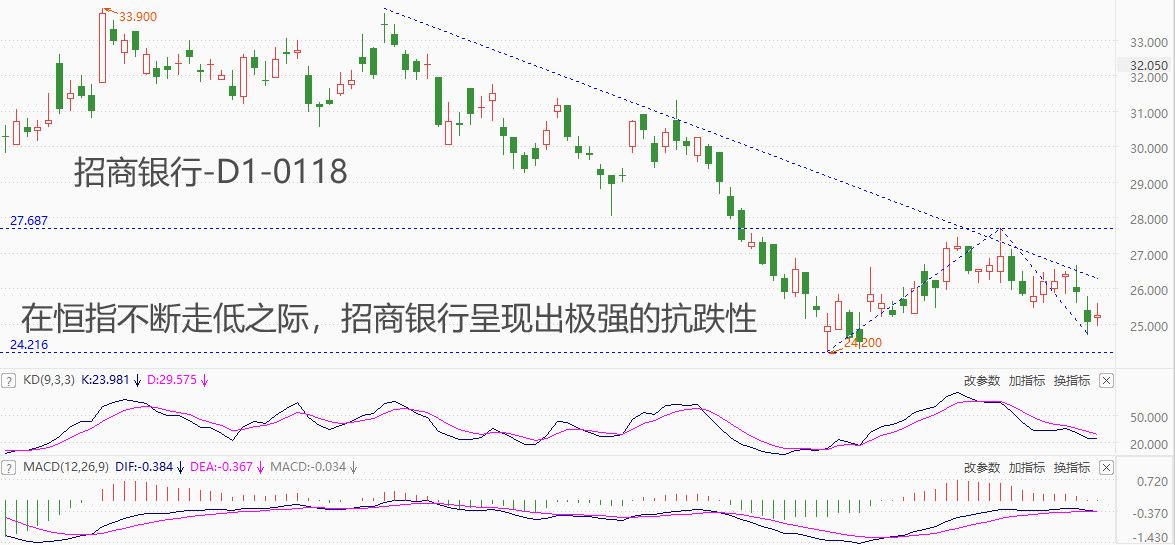 ATFX港股:招商银行股价坚挺,并未跟随恒指持续重挫 ATFX港股:任何剧烈下跌的行情中,总有股价表现坚挺的个股。开年以来,恒生指数的跌幅已经超过10%,市场信心大受冲击,但是,仍有部分个股表现出极强的抗跌属性,比如在A+H两地上市的招商银行。首先来看A股上市的招商银行,去年12月18日至今,累计实现了6.46%的涨幅