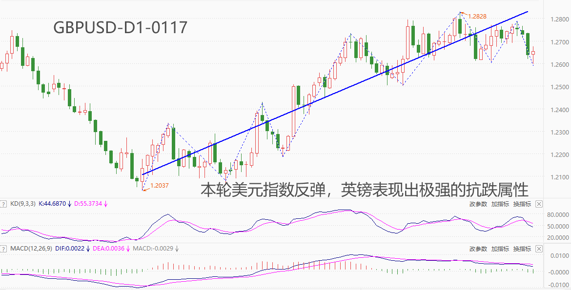 ATFX汇市:美指延续反弹态势,英镑成最佳抗跌货币 ATFX汇市:英镑占美元指数的比重超10%,仅次于欧元和日元,排名第三位。逻辑上讲,美元指数进入强势周期时,英镑大概率将出现贬值走势,亦即GUD下跌。然而,12月28日至今,美元指数累计反弹2.4%,欧元、日元均出现大幅贬值迹象,只有英镑仍保持窄幅震荡态势,表现出