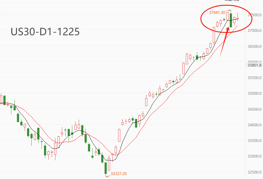 ATFX美股:道琼斯指数出现高位阴线,警惕后市回落风险 ATFX美股:技术分析最大的作用是提示风险。12月20日(上周三),道琼斯指数在经过长周期的上涨之后,突然在相对高位收出一根长阴线。阴线的跌幅1.27%,K线最高点37641.3成为本轮上涨波段的纪录高点。在技术分析的范畴中,存在“高位阴线预示未来将会下跌”的逻辑,