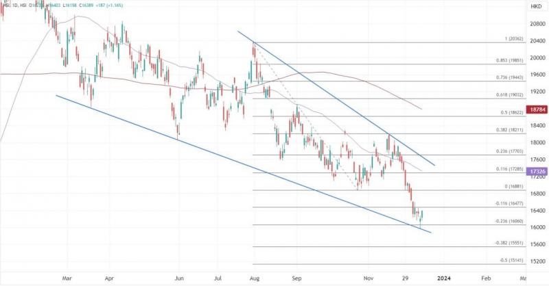 ATFX港股:恒指延续周初反弹,但仍缺乏底部信号 ATFX港股:周一反映中概股表现的金龙中国指数回升,港股三日跌261点收逾一年低后,今早曾弹逾百点。恒指最终半日仍升137点或0.85%,收报16338;国指升1.4%,报5608;科指升1.65%,报3727。 科技指数扭转三连跌,科网股多数见反弹,京东(09618)反弹近3%重上100港元;阿里