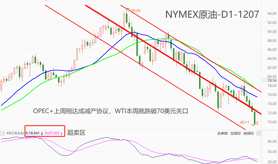 期市:OC+减产未取得预期效果,WTI跌破70美元关口 9月28日至今,WTI累计跌幅25.48%,最低触及69.11美元,跌破重要整数关口70美元。上周,OC+刚刚达成减产协议:沙特将自愿减产石油100万桶/日的政策延长至2024年一季度,阿联酋、伊拉克、科威特等产油国均给出明确减产份额。然而,总计220万桶的减产计划,并没有令油