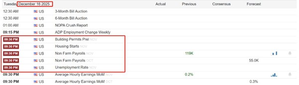 ATFX汇市前瞻:本周五非农延期至16日,11月小非农AD引关注 ATFX前瞻:本周即将发布的经济数据重要性由高到低分别为:美国非农就业报告改期、美国11月AD数据、欧元区11月CI数据,接下来做逐一解读。 ▲ATFX图 美国11月非农就业报告本应在本周五发布,但由于美国政府停摆的影响,发布日期已大幅延后。根据最新