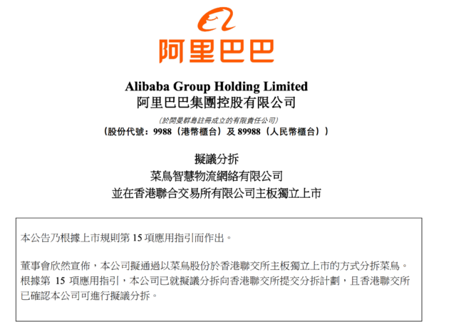 ATFX港股:阿里巴巴旗下菜鸟发起IO,冲击全球智慧物流第一股 ATFX港股:9月26日晚,阿里巴巴(09988)旗下菜鸟智慧物流向港交所提交上市申请,目标最少集资10亿美元,成为阿里巴巴“1+6+”之后首个正式进入IO进程的业务集团,标志着菜鸟正式冲击全球智慧物流第一股。 阿里巴巴港股盘后公告,公司拟通过以菜鸟股份
