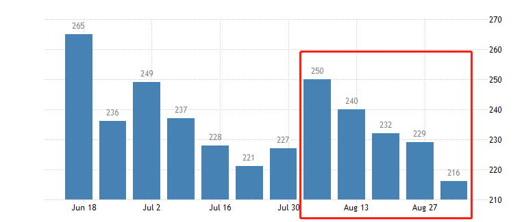 ATFX汇市:美初请失业金人数21.6万人,连降四期,劳动力供需偏紧 ATFX汇市:9月7日,美国劳工部数据显示:美国至9月2日当周初请失业金人数最新值21.6万人,低于前值22.9万人(修正前22.8万人),低于预期值23.4万人。回顾历史数据,美国初请失业率人数从25万人开始下降,至今已持续四期,凸显美国劳动力市场供需偏紧的
