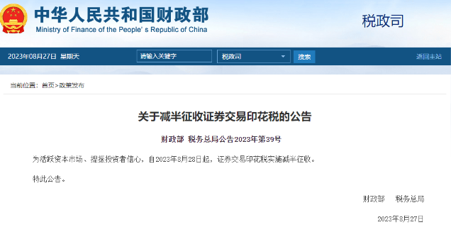 ATFX港股:“三箭齐发”活跃资本市场,时隔近15年下调印花税 ATFX港股:中国财政部周日宣布减半征收证券交易印花税,自2023年8月28日起,证券交易印花税实施减半征收。意味A股证券交易印花税率将由0.1%,下降为0.05%。 经济日报文章指,作为调节资本市场的重要政策工具,今次减半征收而不是一次性取消印花税,既让