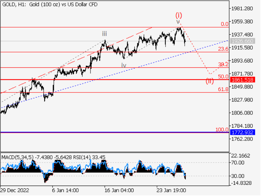 主要场景:金价考虑1861.51以上的多头头寸,修正后的目标为2000.00-2050.00。 另一种情况:突破并盘整1861.51水平将允许该货币对继续下跌至1772.93-1723.86水平。 黄金分析:在日线图上第四波(4)较大程度的时候,一个下降修正似乎已经形成,(4)的波С在内部完成。显然,第五波(5)开始在H4图上形成,(5)中1次的
