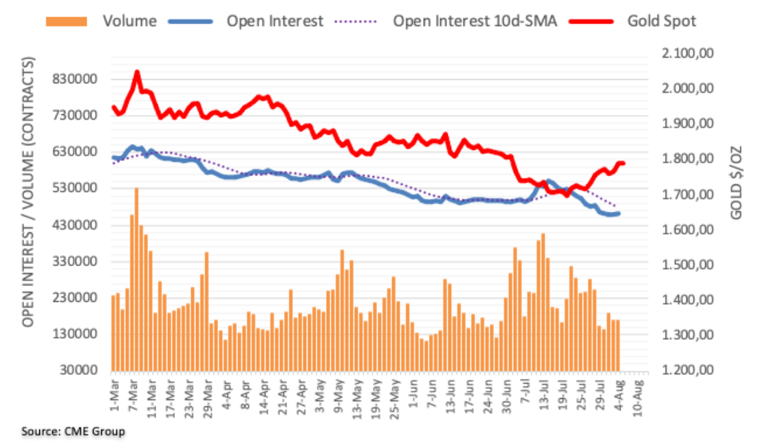 根据芝加哥商品交易所集团(CGrou)的黄金期货初步数据显示,周四未平仓合约逆转连续四个交易日的跌势,当日增加约2500份合约。另一方面,成交量连续第二个交易日萎缩,当日减少了870份合约。 金价目前的目标是1800美元 周四,黄金价格延续了最近的复苏势头,未平仓头寸不断增加。在此背景下,金价仍有望重