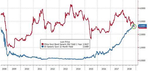 这一转变反映了美联储今年以来三次加息的影响。相比之下,随着经济增长放缓,中国央行维持基准利率不变,并通过其他方式放松了货币政策,比如降低银行存款准备金率。