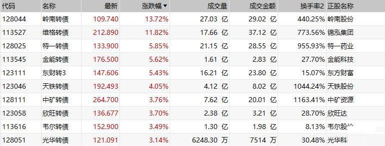 岭南转债涨超13%,维格转债涨近12%,特一转债涨近6%,金能转债和“东财转3”均涨超5%,天铁转债涨逾4%;伊力转债跌超9%,乐歌转债和蓝晓转债均跌逾6%,联泰转债、百川转债和佳力转债均跌逾5%。