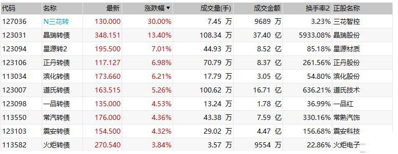 中证转债指数午盘涨0.11%,“N三花转”涨30%,盘中临停;晶瑞转债涨超13%,“星源转2”涨超7%,正丹转债和滨化转债均涨超6%,道氏转债涨超5%,一品转债、常汽转债和震安转债均涨逾4%;众信转债跌超12%,精达转债跌超6%,鼎胜转债跌逾5%。