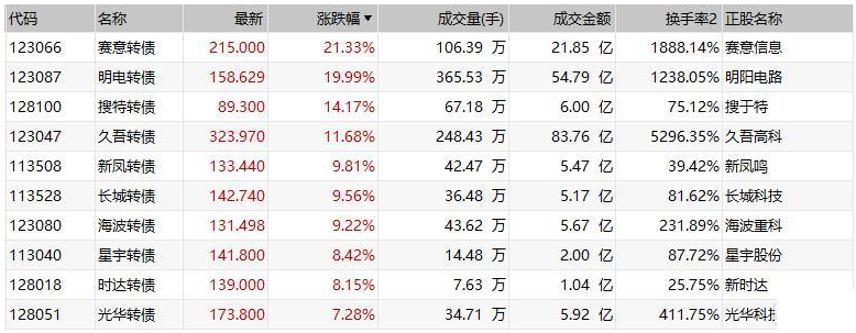 中证转债指数收盘涨1.06%,成交额828.73亿元;赛意转债涨超21%,盘中二次临停;明电转债涨近20%,搜特转债涨超14%,久吾转债涨超11%,三只债券均盘中临停;新凤转债、长城转债和海波转债均涨逾9%;蓝盾转债跌超35%,盘中二次临停;康隆转债跌逾8%,“19华菱EB”跌近6%。