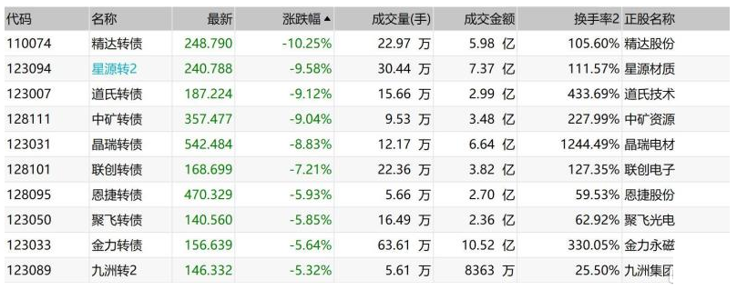 中证转债指数午盘跌0.02%,精达转债跌超10%,“星源转2”、道氏转债和中矿转债均跌超9%,晶瑞转债跌超8%,联创转债跌逾7%,恩捷转债跌近6%,聚飞转债和金力转债均跌逾5%;百川转债和鼎胜转债均涨超13%,三祥转债涨超10%,天康转债涨逾9%。