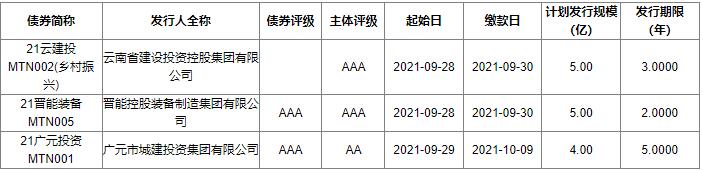 9月26日最新统计数据显示,近期中国债券市场将有3只中期票据发行,计划发行规模共计14.0亿元。其中即将在9月28日招标发行的“21云建投MTN002(乡村振兴)”计划发行金额5亿元,期限为3.00年,主体评级为AAA。具体情况如下: