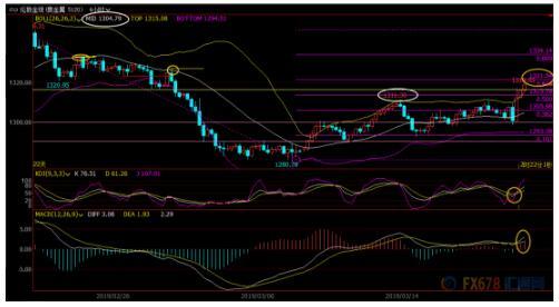 下方1311.30已结转化为初步支撑所在,在失守该位置前,后市偏向多头,布林线中轨支撑在1304.79附近,若意外失守该位置,则削弱短线看涨信号。