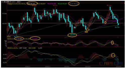 日线级别:震荡下跌;MACD死叉运行且下穿零轴,KDJ死叉运行,汇价失守1月31日以来上涨趋势线支撑跌至200日均线和布林线下轨附近,布林线开口,汇价后市偏向继续下调,进一步支撑在2月1日低点95.39和1月10日低点95.01附近。