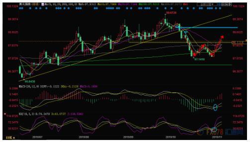 日线级别:震荡后初步上破;MACD金叉,KDJ金叉,汇价初步顶破了97.14-98.00的震荡区间,在失守100日均线97.92前,短线偏向震荡上涨;初步阻力在98.20附近;然后是10月16日高点98.42附近,较强的阻力在10月15日高点98.65附近,10月9日低点阻力在98.89附近,布林线上轨阻力目前在99.17附近。