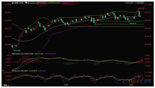 周线级别:震荡上涨后回落;汇价未能顶破布林线上轨阻力,K先出现“断头铡刀”顶部信号,KDJ死叉运行,也有死叉趋势;目前汇价初步失守布林线中轨支撑,后市偏向进一步跌向布林线下轨96.64附近;短线的话1月31日当周低点97.35附近还存在一定的支撑。