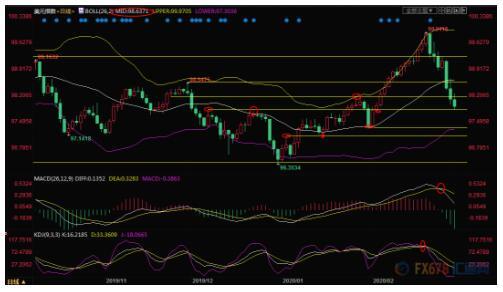日线级别:“倒V”翻转;MACD死叉,KDJ死叉,汇价失守布林线中轨后延续跌势,目前正试探100日均线97.89和200日均线97.85附近支撑,后市偏向进一步跌向100日均线97.30附近,1月31日低点支撑97.35也在该位置附近。